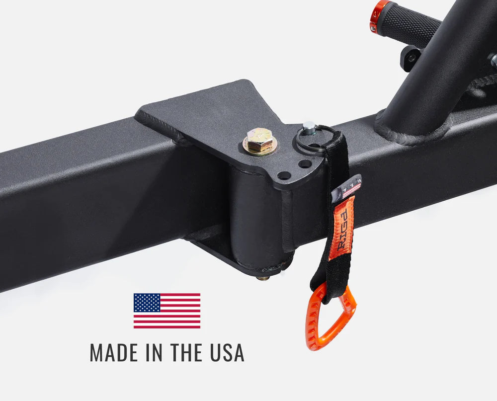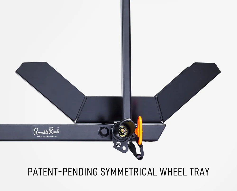 RambleRack™ is designed specifically for use on the UltraSwing, but will also work great on other off-road swing-out bumpers or as a static bike rack plugged straight into your hitch. RambleRack is our single-bike option with a static high-clearance stinger.